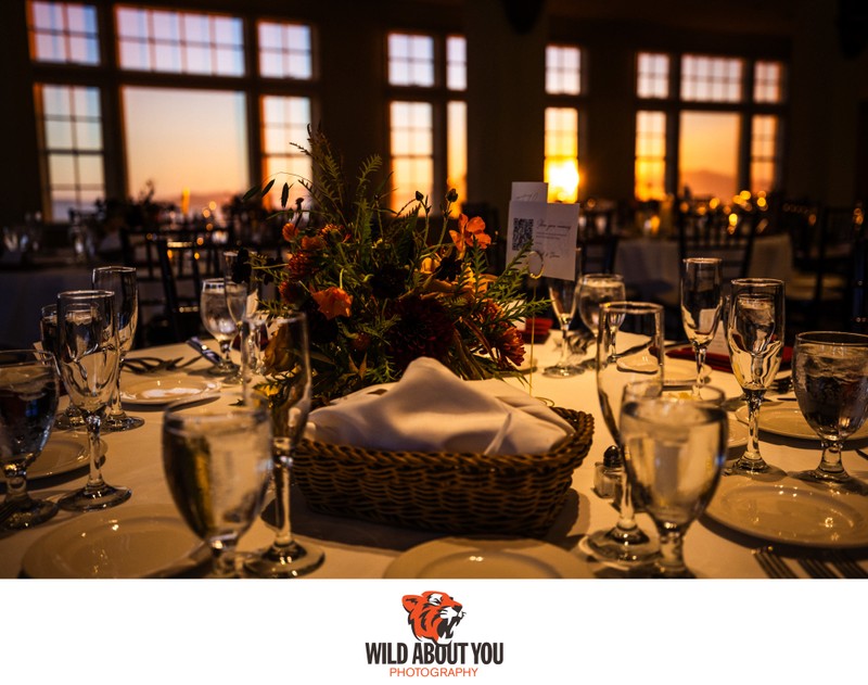 Receptions shine in the gorgeous Bay Ballroom, featuring a vaulted ceiling, dazzling chandeliers, and a fireplace. A wall of windows frames the sunset and distant city lights.